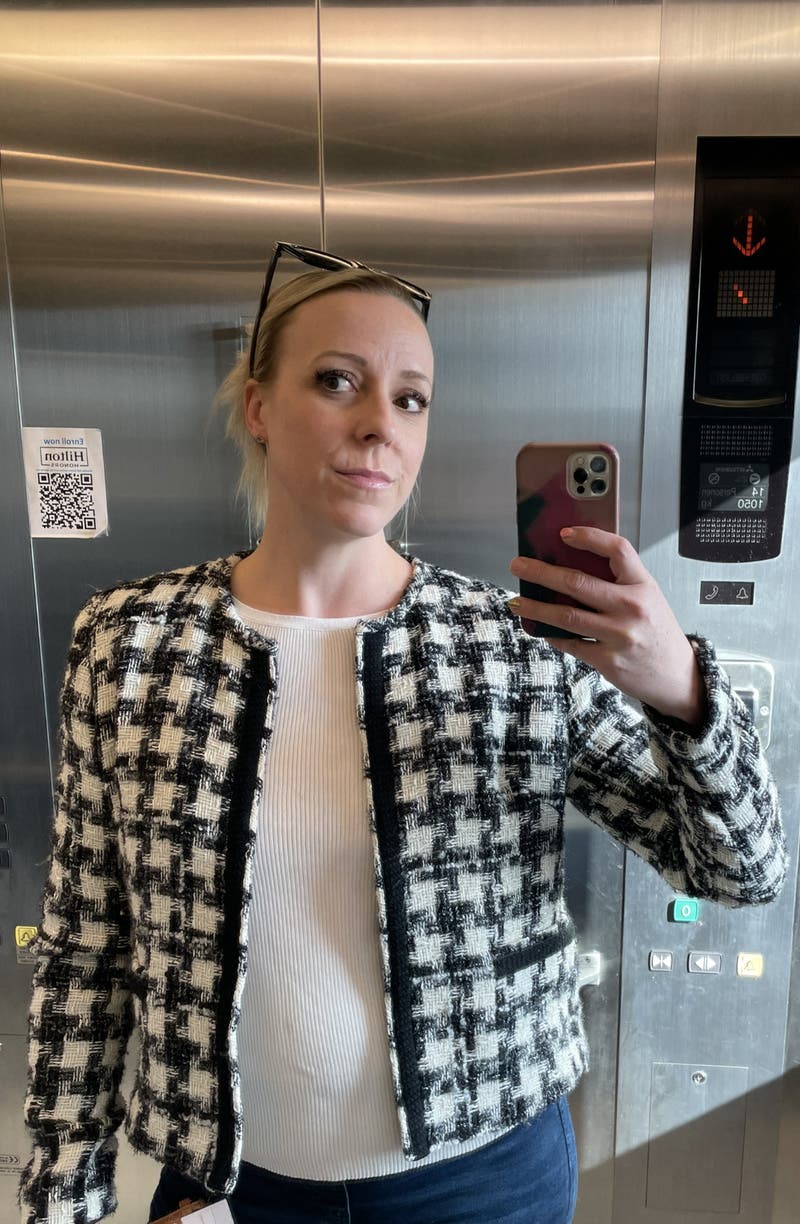 The Upper East Side never looked so chic as in this collarless houndstooth blazer by IRO.
