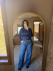 It's a brighter blue than expected but still muted enough that you can wear it to work. Loved the fit with high waisted pants.