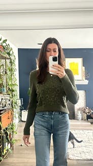 I love this sweater. It is thick, warm, and a little bit itchy, but I can tolerate the itch because it’s adorable. I was afraid that the flowers would make it seem too Holly Hobby but they work to make it more interesting than my other plain sweaters. I am 5’9”, 135 lbs and the size small fit me perfectly. I paired it with Paige Claudine Cropped Flared jeans.