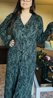 I loved this dress - the deep green color is beautiful and by unbuttoning some of the bottom buttons it was easy to dress it up to transition to evening. The sleeves are flared, so I had to roll them up when washing my hands for example.