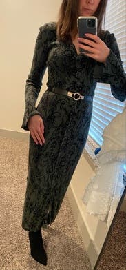 This picture does not do the dress justice. It’s a great dress for a fall or holiday party, it’s comfy, cozy, chic, and giving ‘nature witch’ vibes. The bell sleeves are so fun and got a lot of attention. I highly recommend and am considering keeping it!