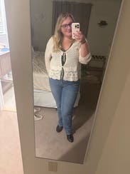 It was a little hard to style but I had two tops I thought worked with it. Sleeves are a little long. But it was fun to try!