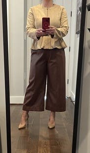 These pants look and feel high end. They’re super trendy, but I was able to make them work appropriate with a mock turtleneck and a blazer. I’m usually a size 12 in pants but the size 12 in these was a little tight in my waist/ belly, which is where I carry my weight. They weren’t uncomfortable … not just particularly flattering. But I liked the look enough to wear it for a day. Will probably rent again in a size up.