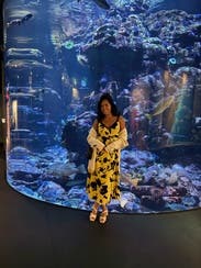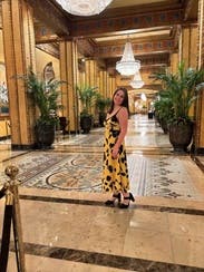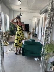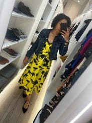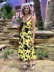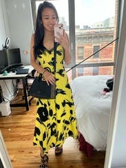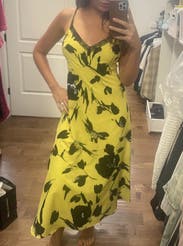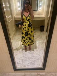 Unique yellow dress. Beautiful fabric, very silky. Wore to Napa valley, such a fun choice.