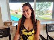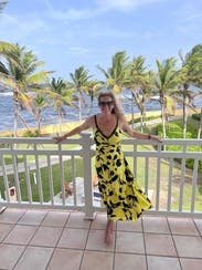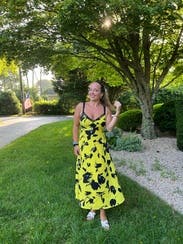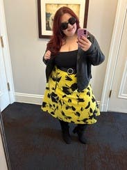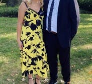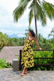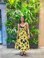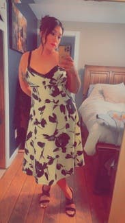 Although I don't have the best picture of this dress as I'm sitting, you can still see from the photo how the form-fitting bodice flatters the bust. Also in the waist, while the flowing skirt offers a comfortable and graceful silhouette. The bold black floral pattern on vibrant yellow fabric makes it a standout choice for a casual yet polished look.