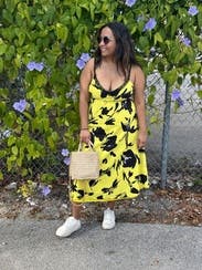 I wore this to a hot summer wedding. It was so light and airy and I was so comfortable in it. The yellow is very bright, but beautiful for a summer event. You could honestly dress it down as well with white tennis shoes. I wore this to the after party as well with white sneakers and it still looked really cute