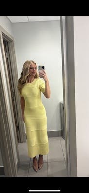 This was a nice heavier material sweater dress to smooth out “bumps” (but I still wore my spanx). It was lined which was nice to about my mid thigh so it was not see through. Lots of compliments on the brightness of the yellow. Would rent again. It’s not that stretchy so if you are between sizes or have a bigger chest I might size up for room. I rented a medium.
