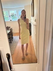 This Jason Wu Collective ribbed knit dress radiates understated elegance with its sleek, form-fitting silhouette and soft yellow hue. Enhance this chic midi with simple gold jewelry and classic black heels.