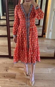 This dress was a little low cut for me, but was very flattering. It's a bright tomato red in a trendy print. Will rent this again.