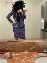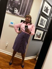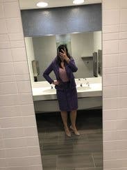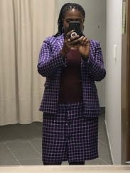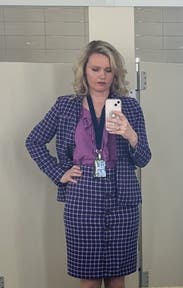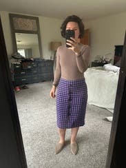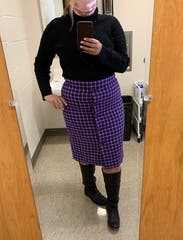 I rented the matching blazer with this. The skirt seemed to run a little bit big. I probably could have sized down. Loved the buttons up the front, but there was also a zip in the back so you don't have to unbutton any of them. Could probably pair this with a light pink sweater. I felt a bit like Elle Woods in the full purple suit.