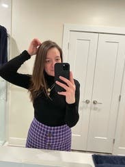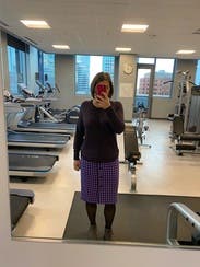 Ok so technically it's not purple. It's a plaid of blue, pink, and burgundy, which actually makes it look purple even in person! I'm a typical 6, but RTR suggest both the 6 and the 8 as a great fit. I chose the 8. It was a little bit loose in the waist (I'm an hourglass so this wouldn't be a problem for Apple figures), but I think had I gotten a 6 it would have been too tight throughout. Overall I loved renting the matching blazer- it was great to brighten up the office on such a rainy day!