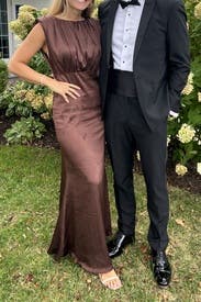 The Jewel x Badgley Mischka Brown Gathered Bust Gown is a stunning piece for a formal event. The gown features a gathered bust detail and a sophisticated, draped fit. For a timeless look, pair it with elegant heels and a clutch.