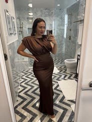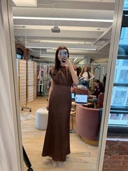 I am absolutely obsessed with this dress! The brown color is perfect for the fall, and the silky material feels luxurious. The boat neckline and cap sleeves give it a super classy and sophisticated look. I'm taller and the length is perfect, hitting right at my feet without dragging. It's an ideal maxi dress for a wedding guest or an upscale date night. The zipper closure on the side and button in the back on the top are nice touches. I would recommend wearing seamless undergarments as you can kind of see through the material, but otherwise, I love everything about this dress!