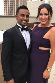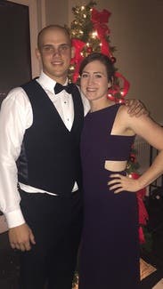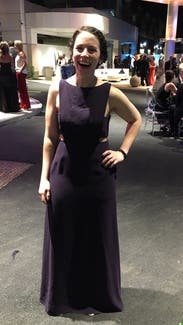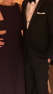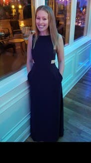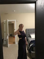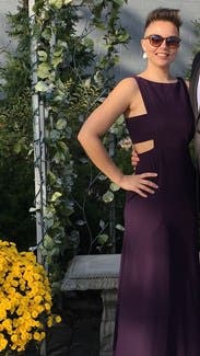 This dress got so many compliments at a very fancy October wedding I attended! (Probably my highest amount of Likes ever on Facebook lol.) It's somewhat simple, yet super sophisticated, is a great deep purple color for fall or winter, and the side cut outs are just the right amount of sexy thrown in. I have a small chest so low-cut gowns and certain strapless bras can be problematic for me, but I didn't have to wear a bra at all with this dress because of the great structure around the torso and thick layer of fabric in the front. (I'm usually around a size 2 in everyday clothes but a 0 in this dress ensured the top was nice and snug without any lose fabric on the sides.) I also have wider hips so it can be a challenge to find a gown that is small enough on top yet can accommodate my bottom half and this dress was perfect for that too. With the pockets (which are also amazing!) the bottoms flares out just enough at the waist to still look form fitting yet be comfortable to move and dance in all night long. I'm also pretty short at just under 5'3" so the petite length was perfect where a low heel would have been fine, but I was able to get away with cute sandals to be more comfortable (since you couldn't really see my feet anyway). I've had success with every dress I've ever gotten from Rent the Runway, but this is my favorite so far!!