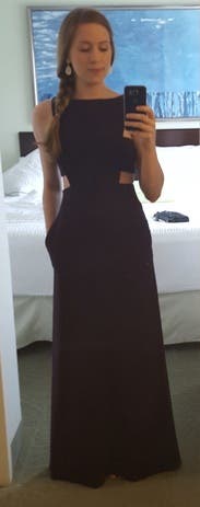 I loved the design of this dress! It was comfortable and flattering, and I thought it looked very sophisticated with the deep purple color and modern cut-outs. The only (slight) downside was that it was too long. I have a hard time believing this is actually a Petite because I'm 5'0" and wearing 4.75" heels, and there was still about 2 inches of the dress dragging on the ground. That being said, I still loved it and would definitely rent it again. Highly recommend!