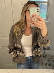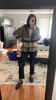 I loved this cardigan so much I almost kept it. I tried an extra small and it still had a slightly oversized fit that was exactly what I was looking for. I was able to throw it on with sweats and jeans and it kept me so warm. It is very slightly itchy, but when worn with a long sleeve it’s super comfy.
