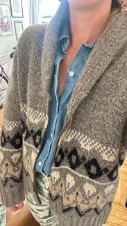 Many, many compliments on this zip up cardigan. It’s easy and warm, but those sensitive to wool might find it itchy.