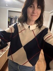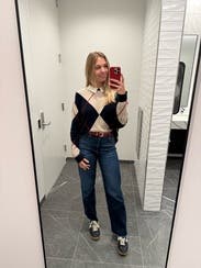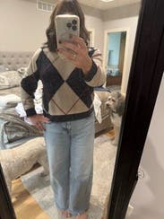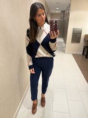 Oversized argyle print in navy, beige and red reads as an updated classic. The cream knit collar added a dressy touch. I wore this with navy trousers and heels to work, and again with jeans and suede loafers on the weekend. Lots of compliments too.