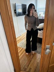 I love these trouser jeans so much that I might have to rent again or buy them. For all of the postpartum ladies that feel some mid-section puff/bloat, these pants worked so well. The wide leg also made me feel more petite. I am in between sizes, and the size up worked perfectly for me. They were so comfortable and flattering. Highly recommend.