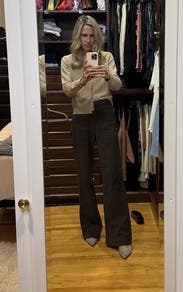 I liked to wear this as an cute coffee brown alternative to jeans when going out to casual lunch or happy hour. These were a little stretchy and forgiving, very high rise plus the zipper on the side is a nice touch. It was a touch long on me (more of a slouchy look in these loafers) but if you have a boot with a little height it works.