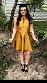 This dress was perfect for my event. A great fall color and easy to accessorize with shoes and a bag I already owned! There were a few frayed pieces near the pockets, but over all the dress was in great shape! The dress runs true to size and I was comfortable with not wearing a bra.