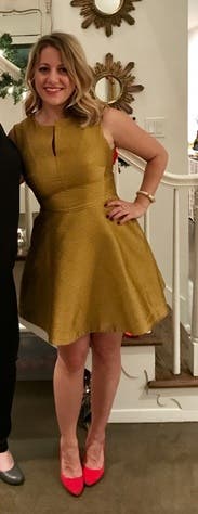 The dress is this gorgeous rich gold, textured, shimmery material. It was perfect with my fave red pumps and some simple, glamorous jewelry. So many compliments, and I felt fabulous. Very flattering fit, the only part that was a little bit snug was the chest. Highly recommend!
