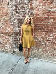Absolutely loved this dress. It is a deep gold and perfect for a wedding/party. It was flattering on my petite frame. I wore a normal bra and didn't even need to wear spanx! If you are taller than 5ft-5'3"ish then it might be too short for you.