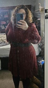 Comfortable and fun fall dress! It's thinner than it looks, so I didn't feel overheated even though it's long-sleeved. I did add a belt because I needed more structure and waist definition, but I rented it knowing I'd add a belt. It's the smallest bit tight in the upper arms for me, but I do have bigger arms so it's not an uncommon problem for me to have. Overall, I really enjoyed it and am most likely going to purchase.