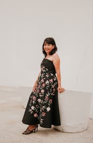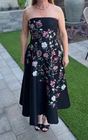 This was a backup so I didn't end up wearing to the event, but it's such a pretty, elegant dress. Gives a beautiful shape at the waste. Felt like I might be pulling it up all night since it's strapless. I'm 5'5 and the 4R was the perfect tea length with a heel.