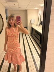 I have some mixed feelings on this one. I LOVED the pattern and the colors but it bunched up around the waist a lot and it was super thick and hot for a summer wedding. I got a lot of compliments but I feel like I look weird in all the photos.