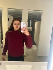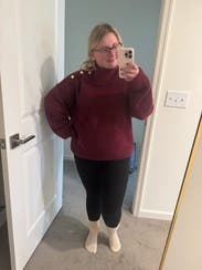 Buttons on shoulder are cute. Sweater is a little bulky.