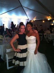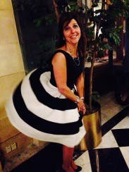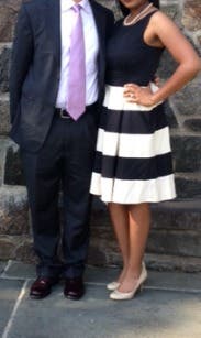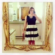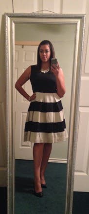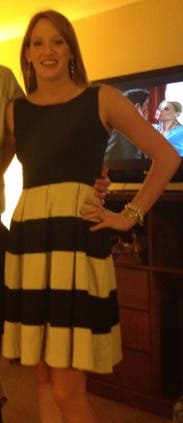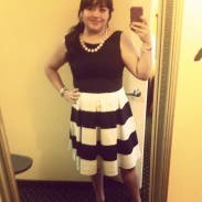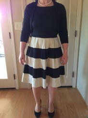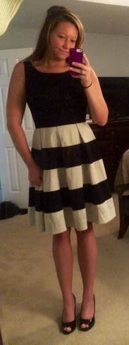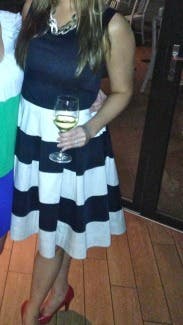 I am hooked on RTR! This is my third rental. The whole process is fun. You get to window shop right in your own home. With the first rental, I was a little nervous thiinking if the dresses didn't fit than what would I do? However, most of us have one or two basic dresses in our closet that we could resort to if it turned out to be a disastor. No such thing has happened after three rentals due to the fact that there are so many great reviews that describe how the dress fits and offer little tips that provide you with enough information to help you make the right choice for your body. Most women like to wear different outfits to their events. How many of us wear the same formal dress more than 2 or 3 times? Sometimes the dresses that we do have in our closet are not appropriate for the occassion. This is my favorite thing about RTR. You can rent an affordable, well made dress that will suit the occassion because of their variety. The Whole In One Dress was just that, "a whole in one" for my wedding occasion. I ordered the 2 and 4 but ended up wearing the 4. The dress is made just a touch big. I wore a wide black belt that clasped in the front (did not come with the dress) and black pumps. It was a comfortable fit and the perfect length. The dress is full from the waist down and the adding belt helped to separate tht fullness. If you have a small waist than a petticoat may help to add fullness but I liked the fullness without the extra poof! It was a cooler night and I added a long black sweater while we were outside. Most people wear black to weddings. This Kate Spade dress was "not just another black dress" but the black and white stripe and full skirt added some fun to my attire. Had so much fun wearing this Whole in One Dress! Thanks RTR for another flawless rental!