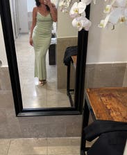 This was my first rental and I would have never picked this color dress to buy but decided to try it! It’s a lot lighter green in person. Fits a little small (got a small and medium and medium fit just right). Just needed some tape on my chest and the straps adjust up and down. It is a little long but I wore a tiny heel bc I hate heels and wanted to be comfy!