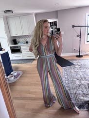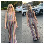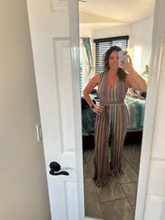 This jumpsuit was spot-on for the 70's-themed dinner party we attended. Paired with some gold jewelry and vintage-style sunglasses, I received so many compliments! The material was shimmery and colorful, however it was a bit itchy (but tolerable, and I have very sensitive skin). My only true complaint is that even the XS was a little roomy on me in the bust and hips, although I feel that it still looked pretty good and that certainly didn't stop me from wearing it.