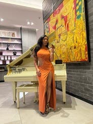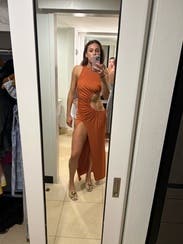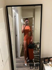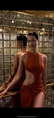 Perfect dress. For like a glove, scandalous slit, beautiful rich burnt orange color, and weighty fabric. I wore the dress twice—outdoor event and club night out. Very versatile