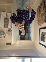 I really like the fun colors in this top, and it's such a nice purple. It's very comfortable and light and it flows well, especially over the stomach which is my trouble area. I did wear a cami underneath it for work since it's a bit low cut, but would go without a cami if I wore it out to dinner or something.