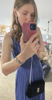 Second time renting!! Simply perfect for a formal event or special evening out. Appreciated the chain strap for hands-free option when carrying a cocktail and “meet and greet” handshakes and hugs. Chain is removable. Lovely as a clutch as well. Does fit iPhone max if not overstuffed with touch up makeup;)