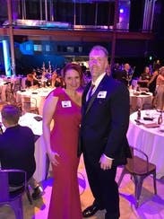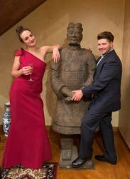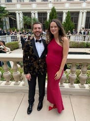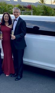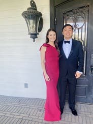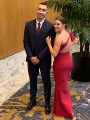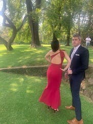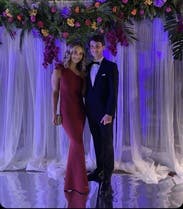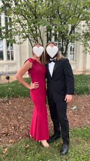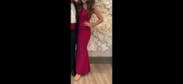 This dress is. A beautiful raspberry color. It's classy with fun elements like this cutout back. Don't be fooled by my fiancé's face! He loved the dress too, just isn't as big of a fan of my antics. I'm 5'7 and wore 3 inch heels. The dress wasn't too short but I wish I had it in the Long length.