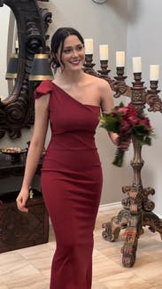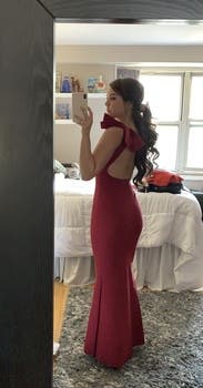 The dress is made in Italy and it shows in the quality. The material is nice and thick to smooth out and hug your figure in the most flattering places. I wore the dress in August for a Black Tie Wedding but could be very nice for a fall/holiday wedding or event. The bow is subtle and the color is between a red and a raspberry shade. Rent the Runway's customer service was also INCREDIBLE and came to the rescue to overnight me this dress to arrive 1 hour before the wedding since the original dress I rented was too revealing. The 40L was a tad long (I am 5'4") but it was what was in stock and it worked fine - but would recommend a regular length if 5'4". This is a very reliable, classy dress for a formal event, I received endless compliments and felt beautiful and confident all night!