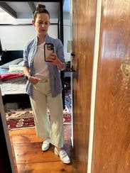 Beautiful color cropped linen pants. Color is true to the picture. All the usual fuss with linen of course-- wrinkles galore. I didn't mess too much and just went with a quick steam as this was WFH. Worn with white lug sole loafers, white tee and lightweight blue shirt blazer.