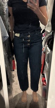 Loved these jeans! They were very soft and stretchy. Button closure added some elevated detail. Very mild barrel leg. Perfect length just above my ankles.