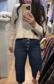 These are really cute jeans. The gold buttons elevate them. I wore with a blazer for a big work meeting and felt amazing. I’ve rented these twice- size 28 was a bit big and size 26 was a bit small. waiting to find them available in 27 which is my usual size.