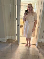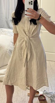 I’m a sucker for a shirtdress and summer linen so I was predisposed to fall for this beauty. I was surprised by the number of compliments I received on this dress because it’s not flashy it’s just a nicely designed summer classic. The fit is true to size. The pockets are deep and nicely placed. The skirt has buttons which can be opened for a flirty look. The color is as pictured and because it’s linen and unlined the only way to avoid wrinkling is to wear a slip. The cut will work on a variety of body types and heights. The tie at the waist allows the wearer to make it more figure flattering. This is a perfect summer dress for the office, county club or just every day wear when you want to look pulled together but not formal or flashy.