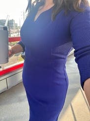 This dress popped. The vibrant color was great. The material was soft and stretchy, hugs in good places. Great work dress.