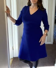 Very comfortable, cute dress. Wore for a trade show event. The fabric has a nice texture to it and vibrant blue color. The 3/4 sleeves and heavier fabric kept me warm in the cooler show floor. Wore with nude heels. Loved the outfit!