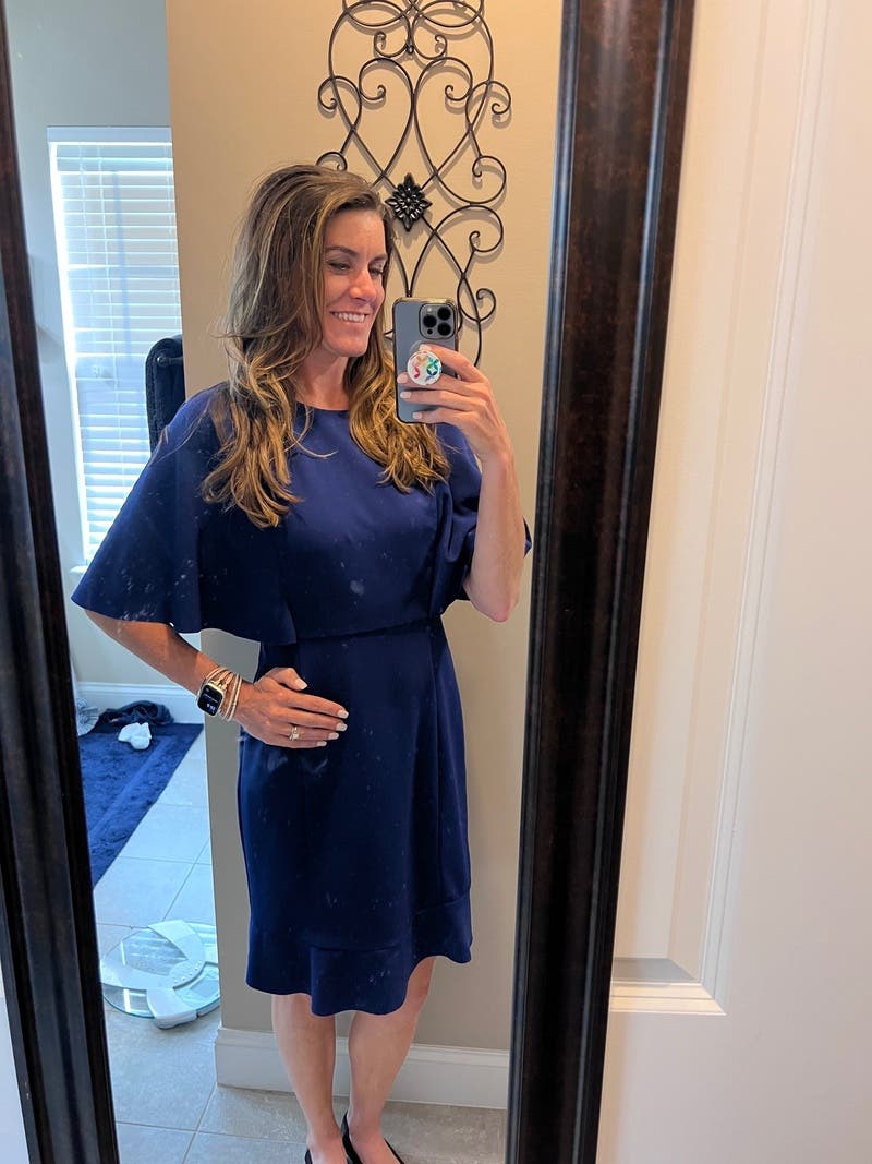 Blue crepe (95% Polyester, 5% Elastane). Hourglass. Short sleeves. Crew neckline. Hidden back zipper closure. Partially lined. 38" from shoulder to hemline. Imported.