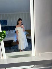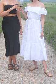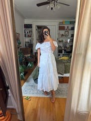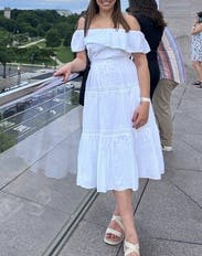 This off the shoulder look is romantic and the perfect dress for weekend wine tasting or wherever your travels may take you! The waist is elastic and the material is thicker and a beautiful eyelet. I would rent again!