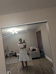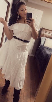 Arrived new with tags and wanted to keep! A perfect white dress for brunch. Waist is adjustable and overall fit is stretchy so I probably could have worn multiple sizes.