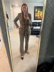 Loved this belted jacket from RL. The style is professional with a little bit of interest. I wore it wtih tan trousers and brown boots. Can't go wrong if you're renting this for the office.