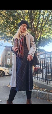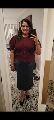 I loved layering patterns with this piece to a maximalist style. Later I styled it to a more neutral look, with fewer layers and had just as much fun. I do think it ran a bit large because the skirt sat lower on the waist than would be normal for a skirt that length. I would size down if I rented it again.